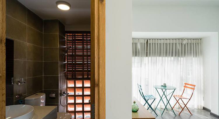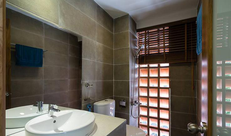 Nhà vệ sinh sử dụng vật liệu hiện đại kết hợp truyền thống độc đáo. Các ô gạch thông gió cùng hệ rèm che chắn đảm bảo sự riêng tư.