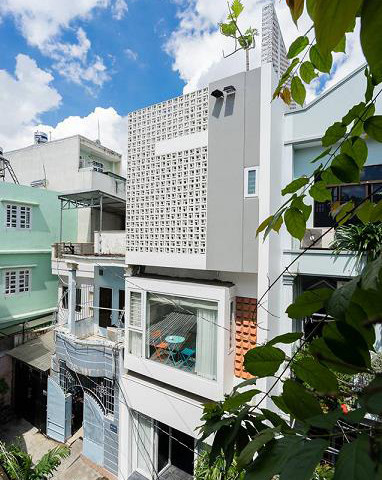 Mặt tiền nhà với hệ lam bằng gạch bông gió giảm thiểu ánh nắng chiếu vào nhà giúp ngôi nhà trở nên thông thoáng hơn.