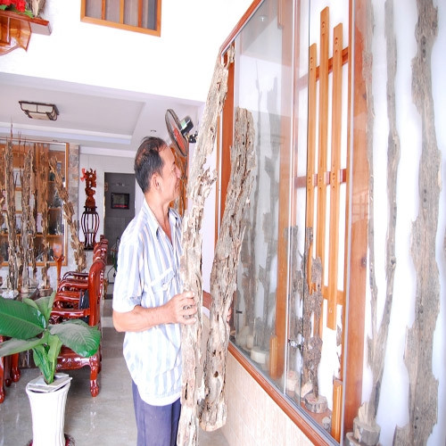 Ông thổ lộ: “Khô mộc trầm có giá trị cao gấp nhiều lần nên tôi thường nghiên cứu cách tạo dáng cho mỗi thân. Hiện tại, tôi đang tạo trầm theo hình dáng rồng cuộn và các thế “độc” khác để tăng cao giá trị cho sản phẩm”.