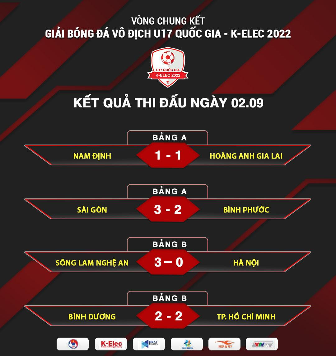 Với những chiến thắng thuyết phục khép lại vòng loại giải U17 Quốc gia - K-Elec 2022 của 2 bảng A, B đã xác định được các đội bước tiếp vào vòng tứ kết là các đội trẻ: Sông Lam Nghệ An, Hà Nội, Hoàng Anh Gia Lai và Sài Gòn.\