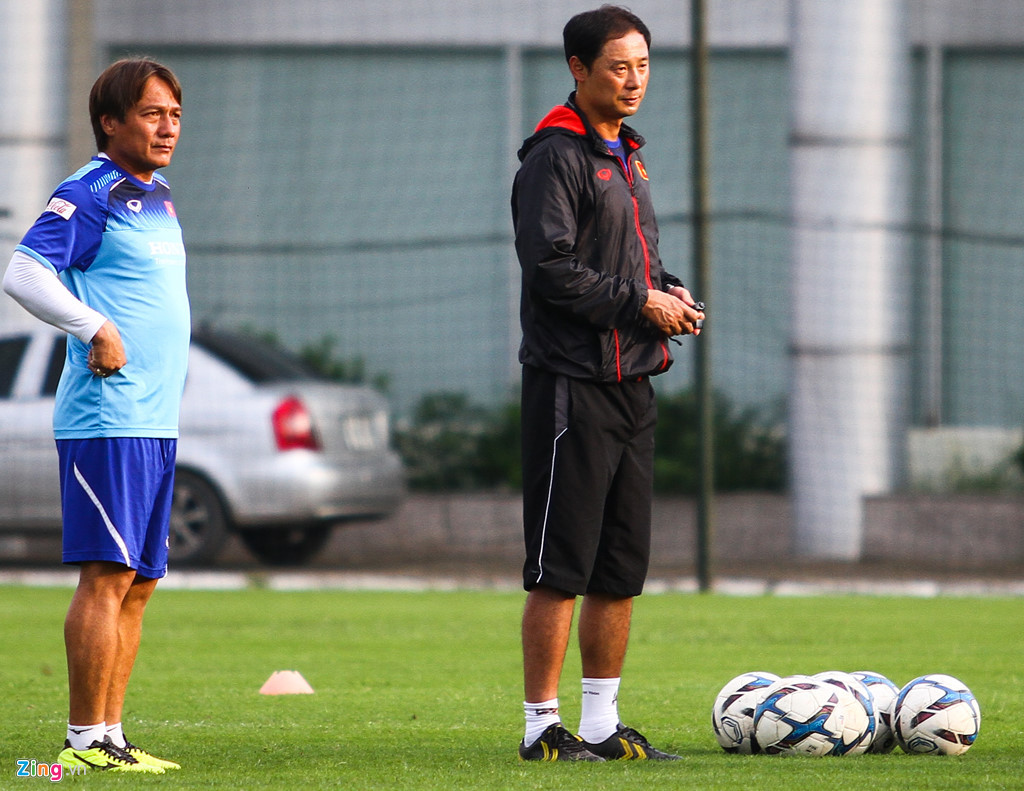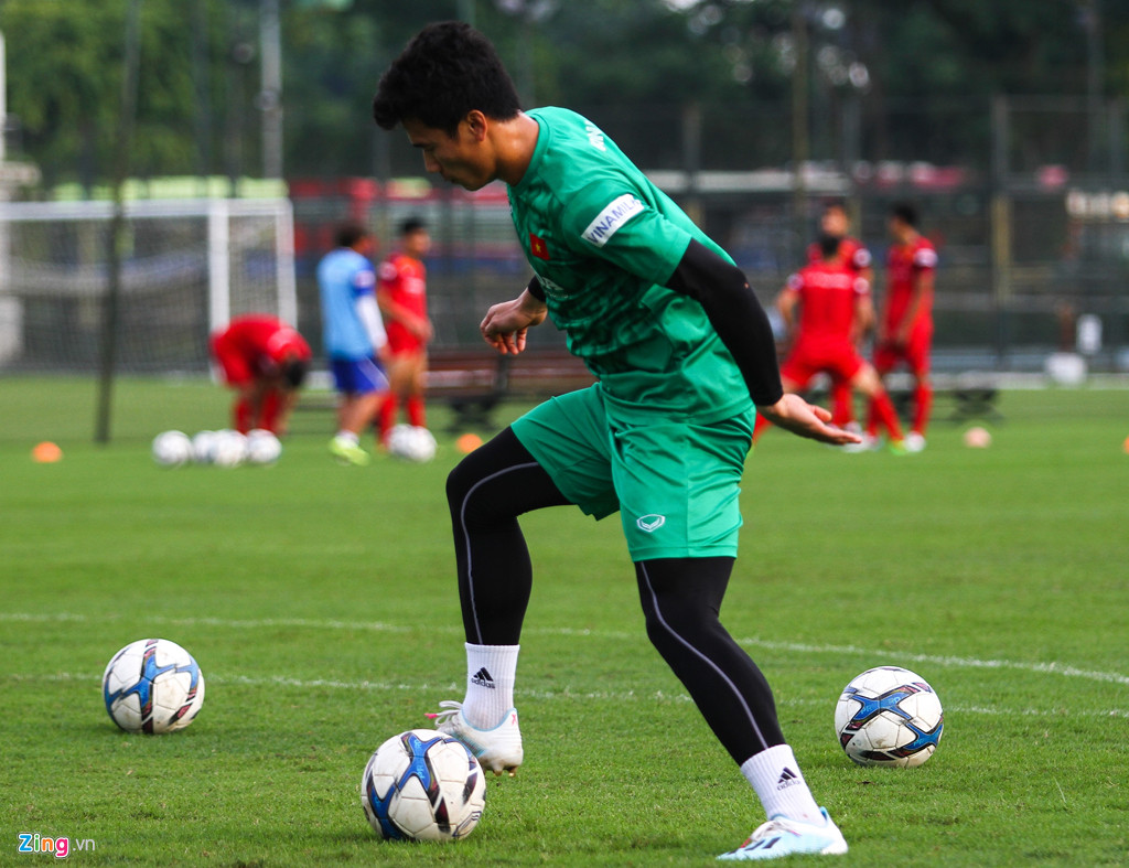Sau bài tập đầu tiên, các tuyển thủ được chia thành 4 nhóm để chơi bóng "ma". Ở nhóm của 4 thủ môn, Bùi Tiến Dũng tỏ ra nhỉnh hơn so với các đồng đội trẻ tuổi còn lại ở khả năng chơi bóng bằng chân.