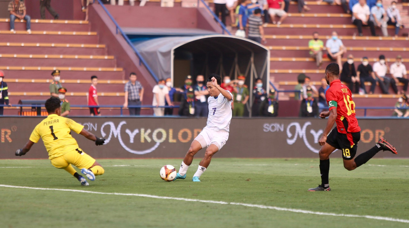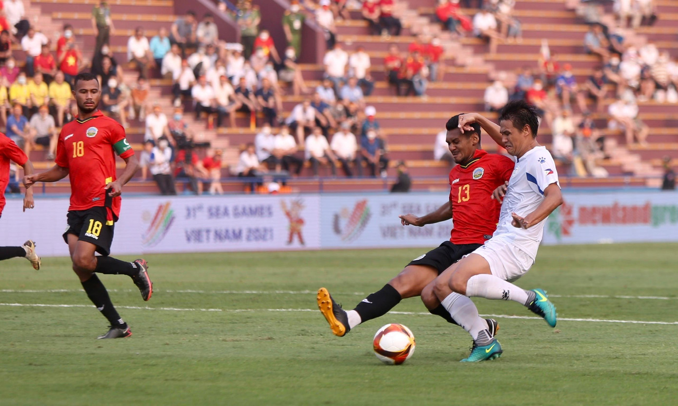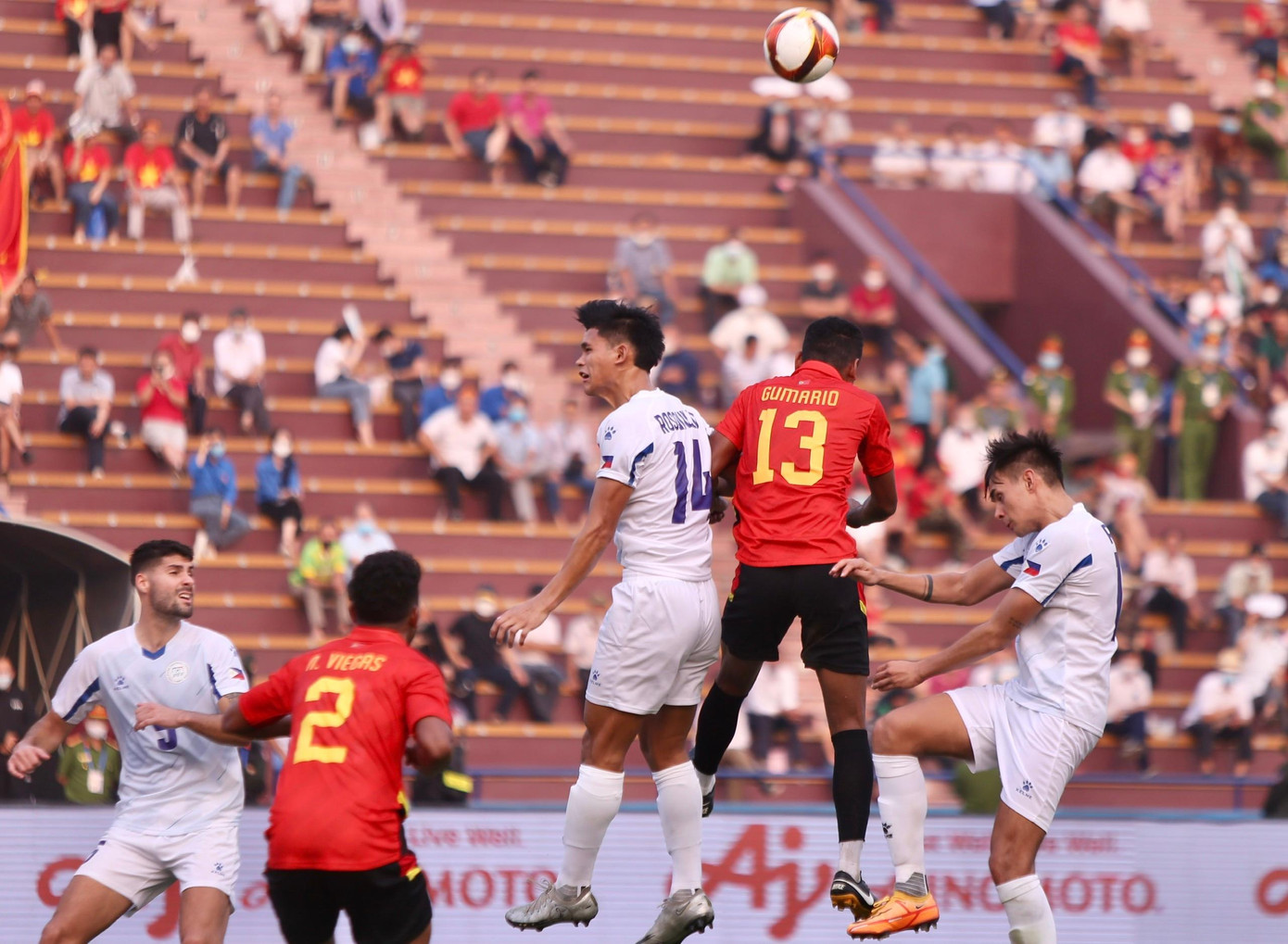 Trong trận đấu đầu tiên của SEA Games 31, U23 Philippines vượt trội đối thủ về thể hình, chất lượng của các cầu thủ, vì vậy họ không gặp nhiều khó khăn trong việc áp đặt lối chơi lên Timor Leste. Trong hiệp 1, bóng phần lớn lăn bên phần sân của đội bóng áo đỏ.