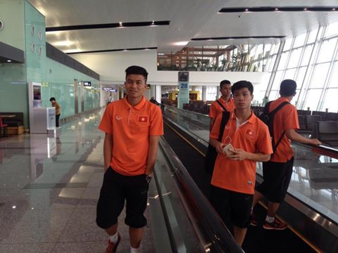 Toàn đội có mặt tại sân bay Nội Bài (Hà Nội) vào lúc 6h hôm nay để làm thủ tục trước khi lên đường sang Singapore. Trong ảnh: Mạnh Hùng và Công Phượng tại sân bay. Ảnh: Vĩnh Xuân