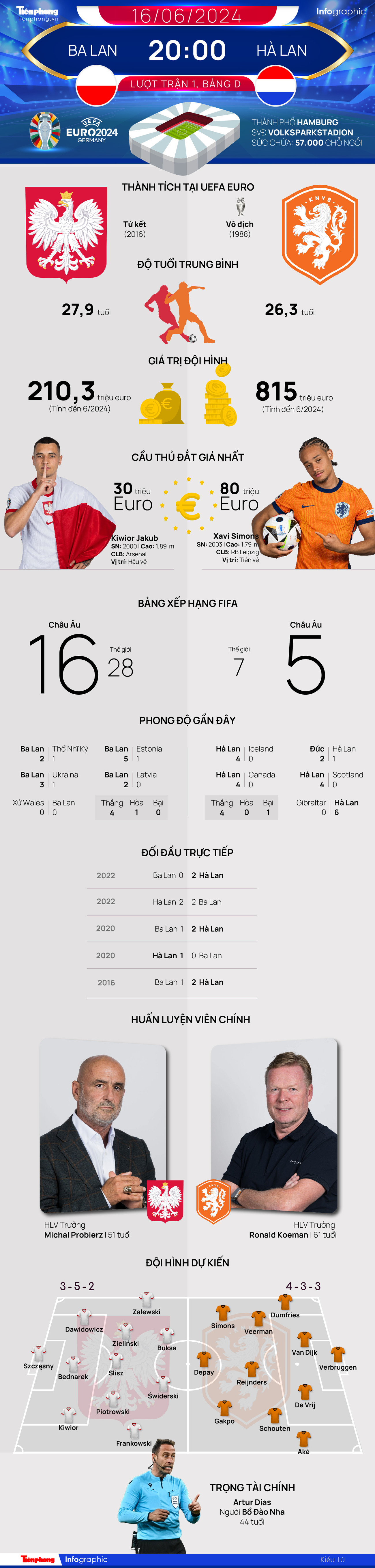 TPO - Trận đấu Ba Lan và Hà Lan tại bảng D Euro 2024 lúc 20 giờ ngày 16/6 được xem là trận đấu rất khó khăn cho “Đại bàng trắng” bởi trong đội hình ra sân có thể thiếu sự phục vụ thủ quân Lewandowski đang dính chấn thương.