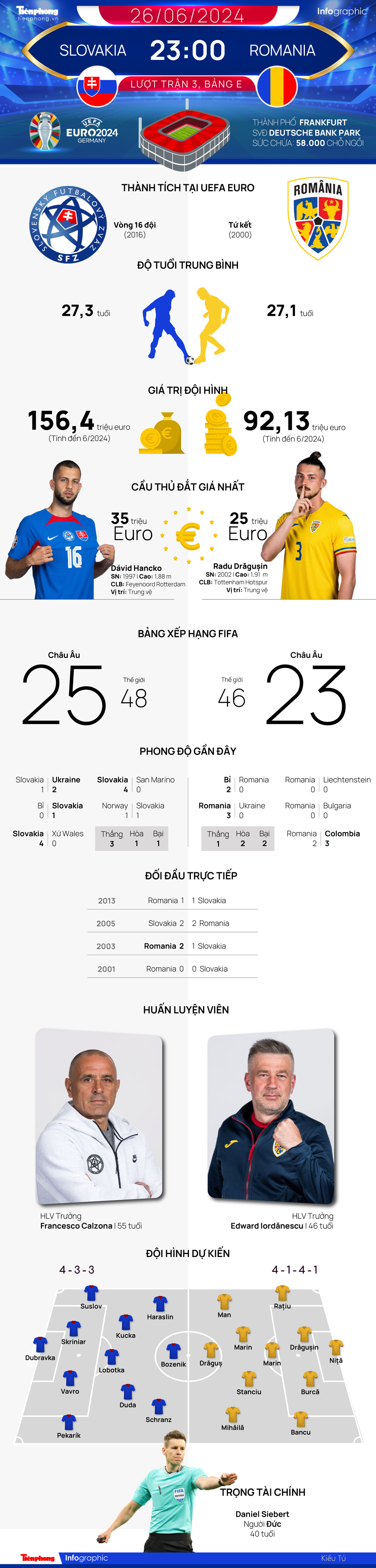 TPO - Trận đấu Slovakia và Romania diễn ra vào lúc 23 giờ ngày 26/6 trong khuôn khổ lượt cuối bảng E EURO 2024. Đây là bảng đấu khá thú vị khi mà sau 2 lượt trận đầu tiên, cả 4 đội đều có cùng 3 điểm. Điều đó có nghĩa cơ hội tiến vào vòng trong đang chia đều cho các đội. Do vậy, cả Slovakia và Romania đều có quyền tự quyết, ‘thắng ở lại, thua về!’, thậm chí, chỉ cần một kết quả hòa cũng đủ đưa cả 2 vào trong.
