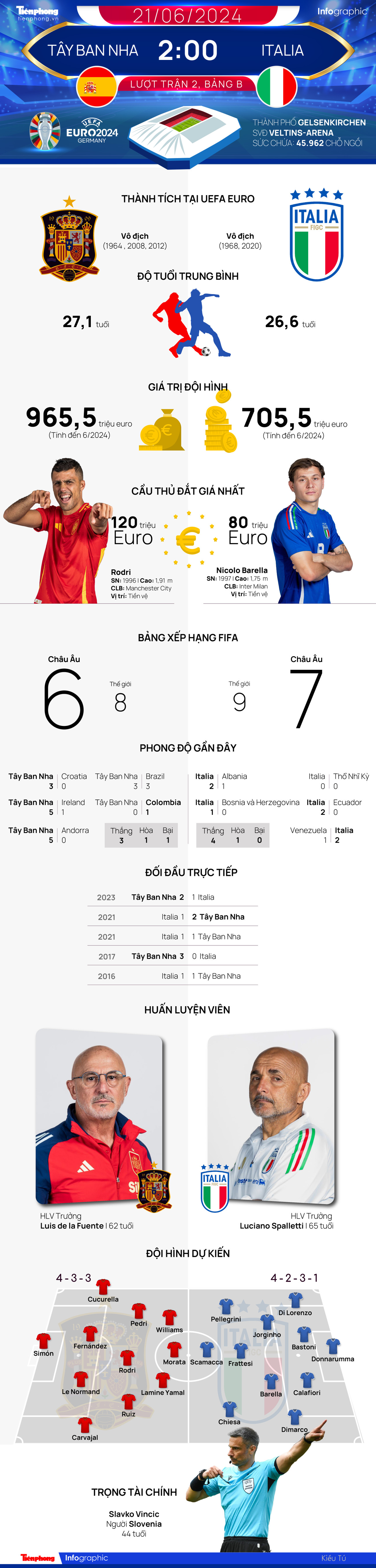 TPO - Hai đội bóng đầy duyên nợ tại các kỳ EURO, Tây Ban Nha và Italia, có trận chạm mặt lần thứ 5 liên tiếp ở giải đấu này vào lúc 2 giờ ngày 21/6, trong khuôn khổ lượt trận thứ 2 bảng B EURO 2024. Trước đó, Đội bóng Thiên Thanh đã 2 lần loại Tây Ban Nha trong 2 kỳ EURO gần nhất.