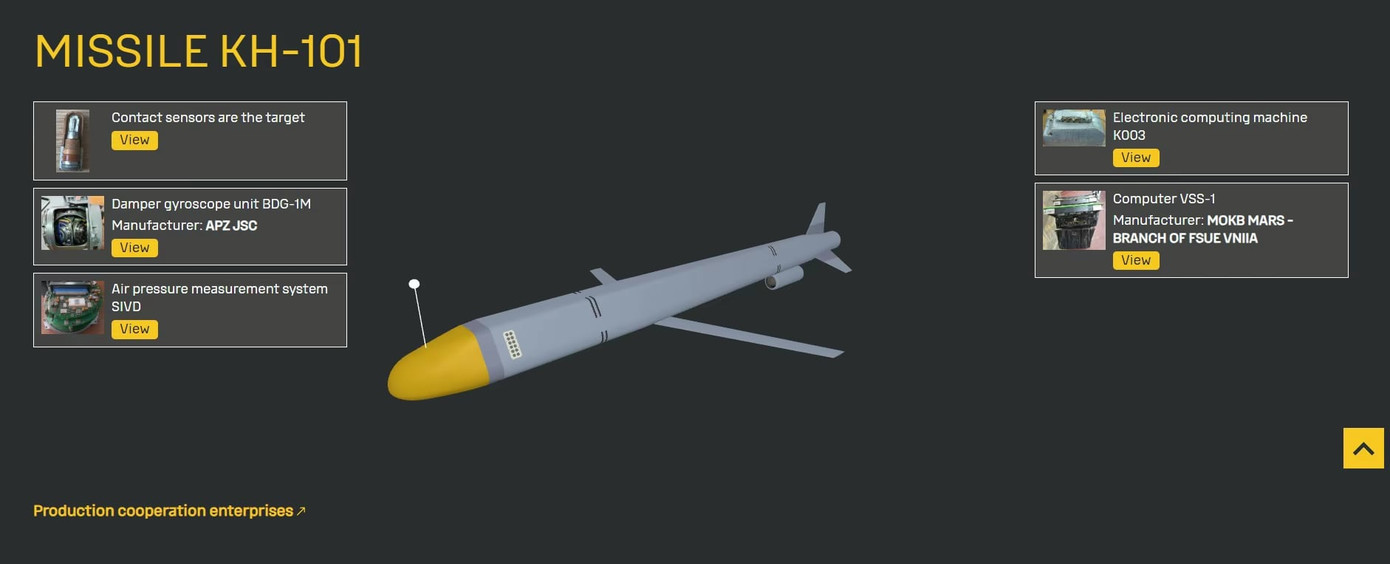 Theo Cơ quan Tình báo Quốc phòng Ukraine (DIU), hơn 70 công ty đã tham gia phát triển và sản xuất Kh-101 cùng các bộ phận của tên lửa này, từ động cơ phản lực, hệ thống dẫn đường, đến thiết bị điện tử, ổ bi và các vật liệu khác.