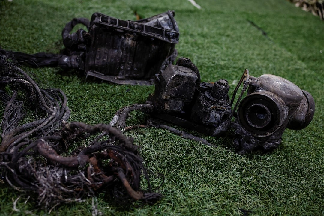 Những mảnh vỡ bị cháy xém và vỡ vụn được đặt trên giá tại một cơ sở giám định vũ khí. Các chuyên gia Ukraine đang nghiên cứu những mảnh vỡ này để hiểu hơn về chuỗi cung ứng, sản xuất của Nga, từ đó đề ra các biện pháp đối phó.