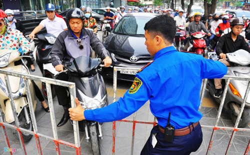 Sáng 19/4, nhiều tuyến đường ở Hà Nội lâm vào cảnh ùn tắc giao thông kéo dài. Một số nhân viên bảo vệ tòa nhà bên đường Trần Duy Hưng kéo rào chắn, không cho xe máy đi lên vỉa hè.