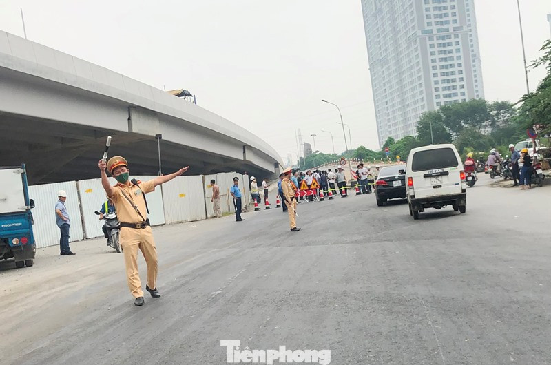 CSGT đứng đầu cầu Thăng Long hướng dẫn phương tiện rẽ sang các tuyến đường đã có phương án phân luồng.