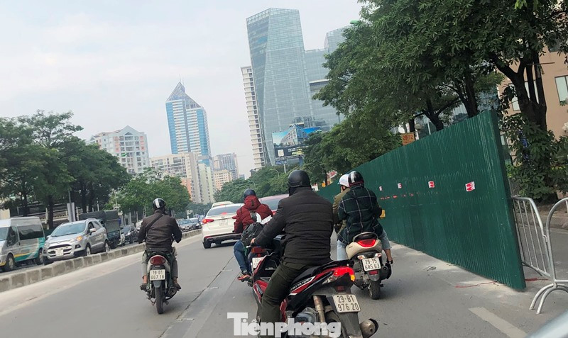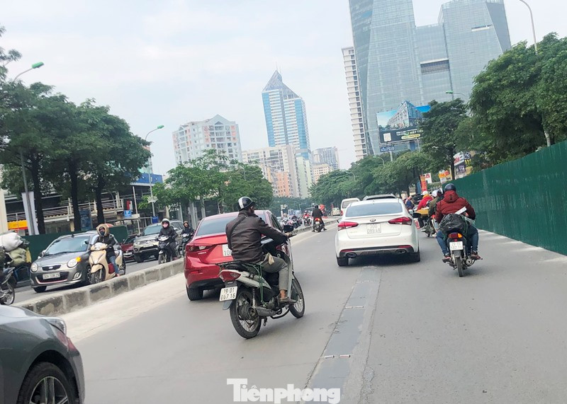 Do hàng rào thi công chiếm 1/2 lòng đường xe hỗn hợp, nên nhiều ngày qua, cả xe máy và ô tô đã tràn sang cả làn đường BRT để đi lại.