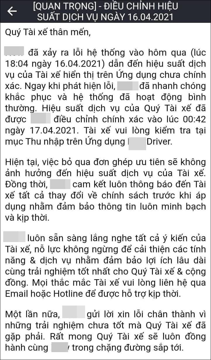 Trước phản ánh này của các tài xế cũng như khác hàng, ứng dụng N. đã gửi thông báo, thừa nhận rằng đã xảy ra lỗi hệ thống dẫn đến hiệu suất dịch vụ của tài xế hiển thị trên ứng dụng chưa chính xác. Vấn đề ghép đơn gây bức xúc cho các tài xế cũng như khách hàng đã được hủy bỏ và ứng dụng cũng cam kết sẽ lắng nghe ý kiến từ mọi người để cải thiện chất lượng dịch vụ.