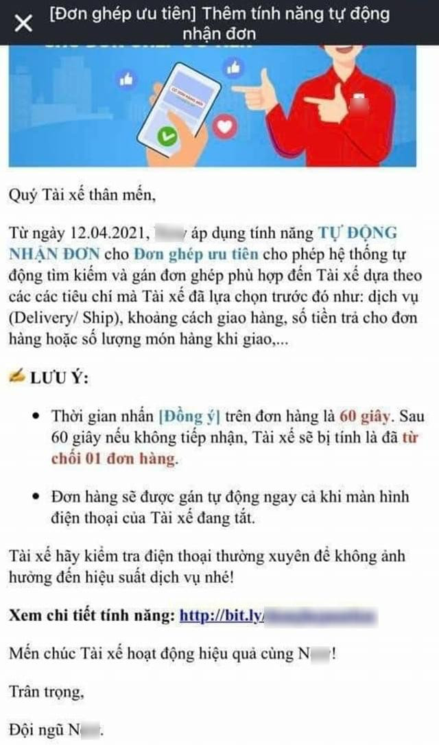 Theo nội dung của bài đăng, các tài xế bị ép phải nhận đơn ghép từ 2 quán trở lên, nếu không sẽ mất thưởng ngày. Nếu chẳng may khách đợi quá lâu, đến nơi không muốn nhận đồ nữa thì tài xế sẽ phải ôm đơn, chịu tiền đền bù. Người đăng bài còn chỉ ra sự thiếu minh bạch trong việc phân chia tiền giao hàng không đồng đều giữa tài xế đối tác với công ty.