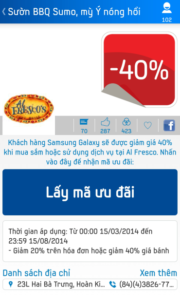 Với ứng dụng “Quà tặng Galaxy”, người dùng của Samsung sẽ nhận được đặc quyền là những ưu đãi có giá trị lớn từ những thương hiệu tên tuổi thuộc nhiều lãnh vực thời trang, ăn uống, giải trí và làm đẹp. Ví dụ người dùng sẽ nhận được ưu đãi giảm 10% khi mua vé xem phim tại cụm rạp của CGV trên toàn quốc, hay giảm 15% khi mua sắm tại cửa hàng thời trang Ninh Khương và thậm chí giảm đến 40% cho những hóa đơn pizza tại nhà hàng Pizza Pepperonis. Thật đơn giản và thuận tiện để có những bữa ăn ngon, những hoạt động giải trí cùng gia đình với chi phí tiết kiệm nhờ ưu đãi từ ứng dụng “Quà tặng Galaxy”.