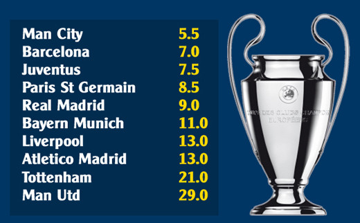 Man City được đánh giá cao nhờ dàn cầu thủ tài năng đang vào độ chín và đã gắn bó cùng nhau khá lâu. Với những gì Pep Guardiola thể hiện ở Etihad, các nhà cái tin tưởng đội vô địch nước Anh có thể làm nên chuyện ở châu Âu.