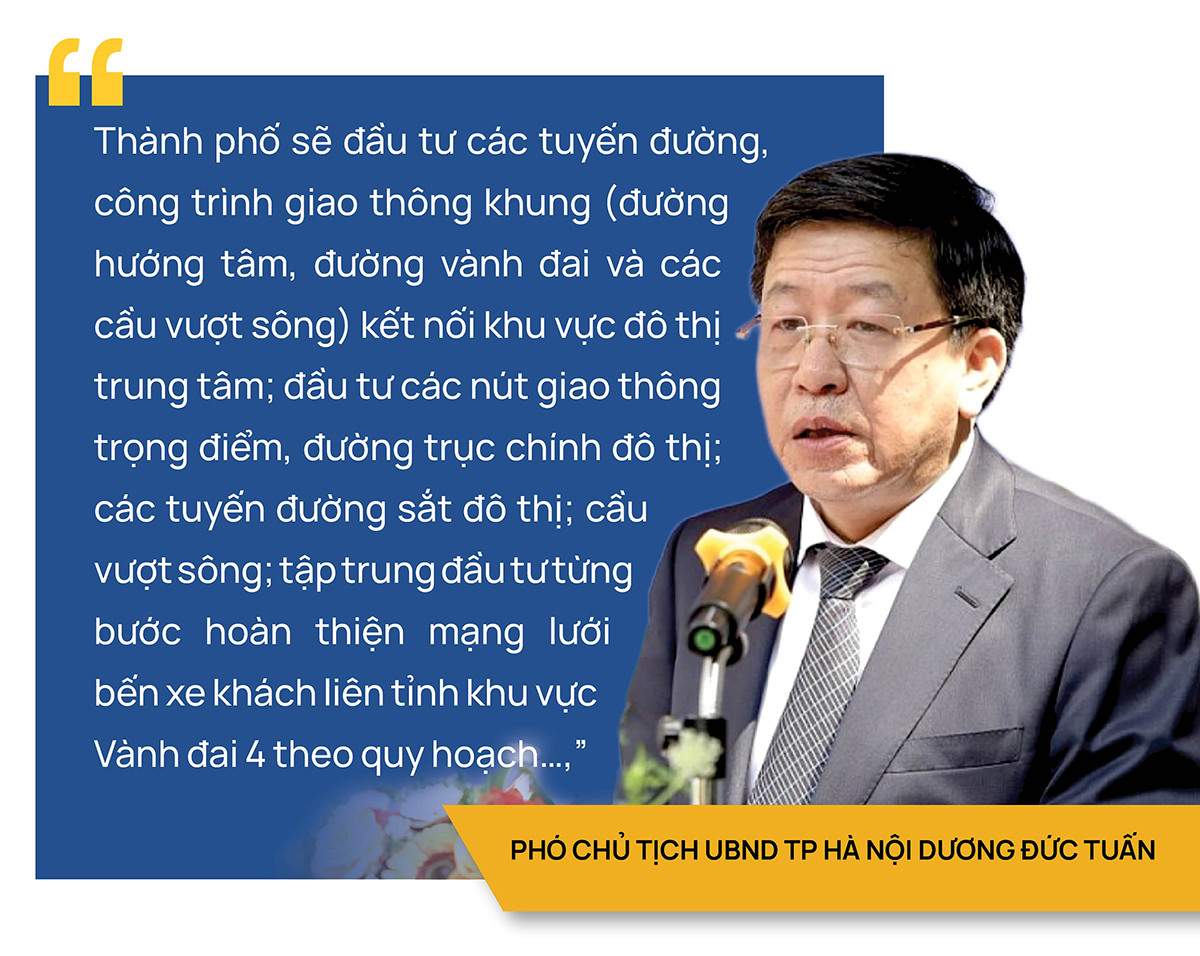 “Thành phố sẽ đầu tư các tuyến đường, công trình giao thông khung (đường hướng tâm, đường vành đai và các cầu vượt sông) kết nối khu vực đô thị trung tâm; đầu tư các nút giao thông trọng điểm, đường trục chính đô thị; các tuyến đường sắt đô thị; cầu vượt sông; tập trung đầu tư từng bước hoàn thiện mạng lưới bến xe khách liên tỉnh khu vực Vành đai 4 theo quy hoạch…,” ông Tuấn nói.