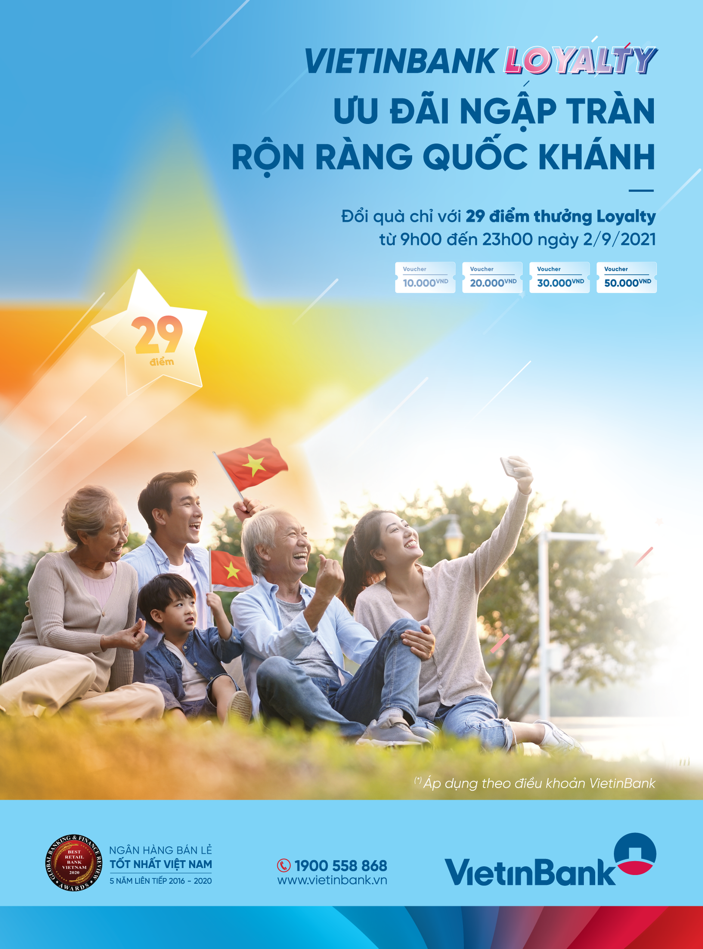 Chương trình được triển khai từ 9h00 đến 23h00 duy nhất ngày 2/9/2021. Chỉ với 29 điểm Loyalty, cùng các thao tác đơn giản trên VietinBank iPay Website/Mobile, quý khách dễ dàng sở hữu ngay Voucher quy đổi thành tiền vào Tài khoản thanh toán lên tới 50.000 đồng. Tiền sẽ được tự động cộng vào Tài khoản có biến động số dư gần nhất của khách hàng sau 18h00 của ngày tiếp theo. Tổng số lượng voucher quà tặng lên đến 2.600 vouchers với mệnh giá 10.000đ, 20.000đ, 30.000đ, 50.000đ.