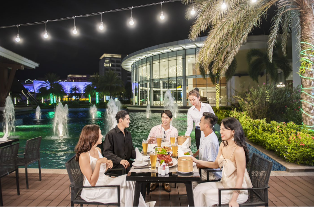 Vinpearl đón du khách với không gian thiên nhiên tuyệt mỹ của resosrt biển 5 sao đẳng cấp quốc tế với phòng nghỉ riêng tư hay villa hướng biển kiến trúc tân cổ điển sang trọng. Tiên đường ẩm thực hội tụ đặc sản các vùng miền hay tinh hoa món ngon Á – Âu tại Vinpearl sẽ chiêu đãi du khách những đại tiệc buffet khó quên trong mỗi kỳ nghỉ. Di chuyển sang Grand World, du khách còn bắt gặp nhiều “menu tự chọn” đặc sắc của thành phố đảo như hải sản Hàm Ninh, bún quậy Kiến Xây, bò tơ Phú Quốc hay trải nghiệm food-tour 5 châu dọc theo các tuyến phố náo nhiệt.