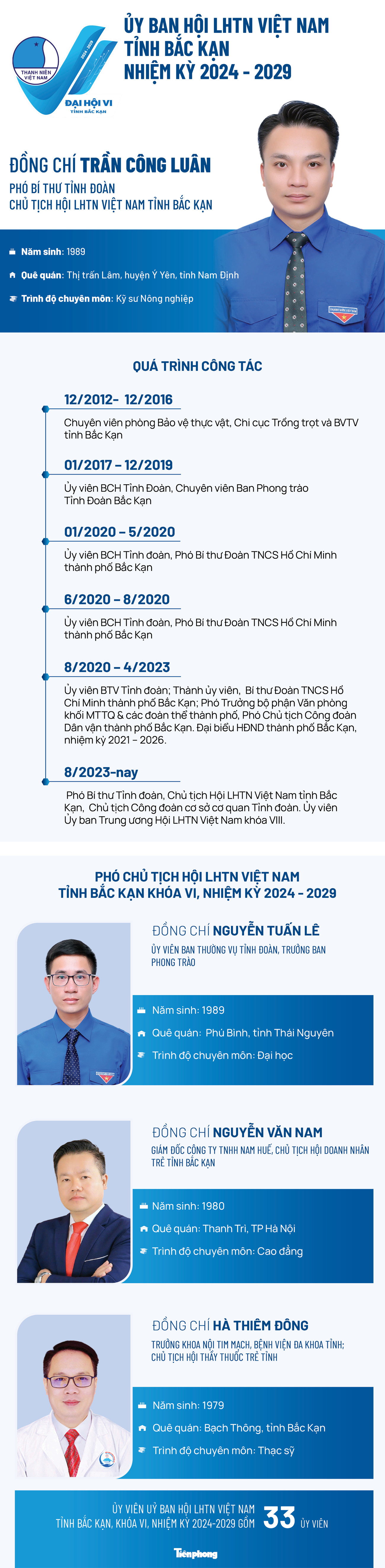 TPO - Đại hội đại biểu Hội LHTN Việt Nam tỉnh Bắc Kạn lần thứ VI, nhiệm kỳ 2024 - 2029 đã hiệp thương chọn cử 33 anh, chị tham gia Ủy ban Hội, anh Trần Công Luân làm Chủ tịch Hội LHTN Việt Nam tỉnh Bắc Kạn lần thứ VI, nhiệm kỳ 2024 - 2029. Các Phó Chủ tịch gồm các anh: Nguyễn Tuấn Lê, Nguyễn Văn Nam, Hà Thiêm Đông.