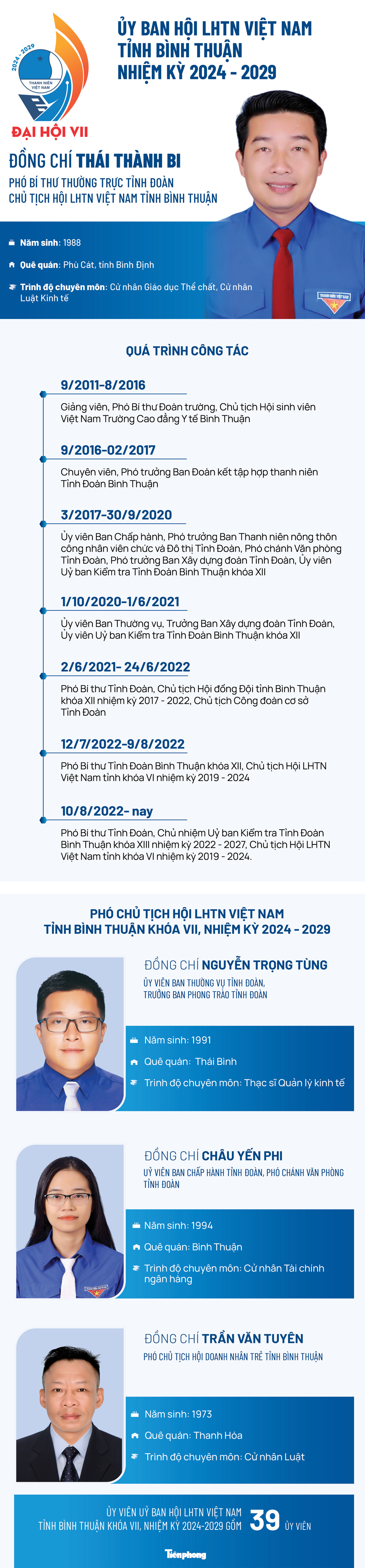 TPO - Đại hội đại biểu Hội LHTN Việt Nam tỉnh Bình Thuận lần thứ VII, nhiệm kỳ 2024 - 2029 đã hiệp thương chọn cử 39 anh, chị tham gia Ủy ban Hội. Anh Thái Thành Bi làm Chủ tịch Hội LHTN Việt Nam tỉnh Bình Thuận lần thứ VII, nhiệm kỳ 2024 - 2029. Các Phó Chủ tịch gồm các anh, chị: Nguyễn Trọng Tùng, Châu Yến Phi, Trần Văn Tuyên