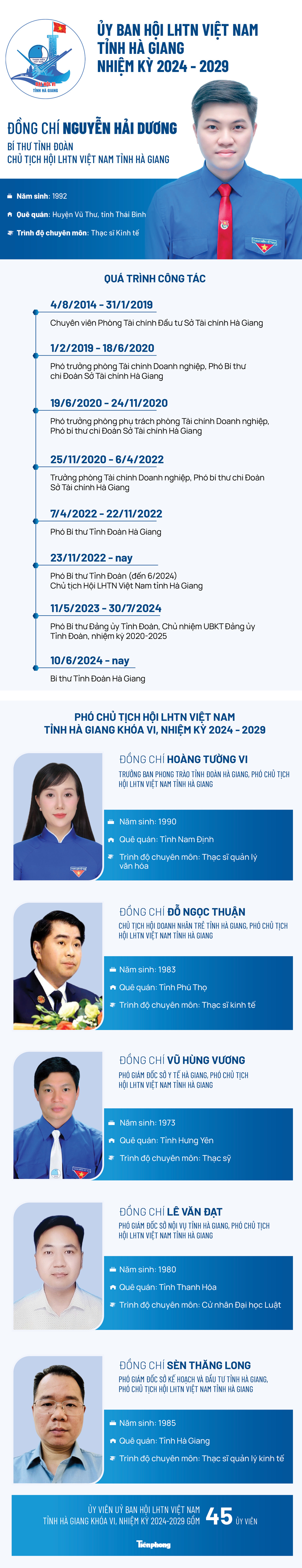 TPO - Đại hội đại biểu Hội LHTN Việt Nam tỉnh Hà Giang khóa VI, nhiệm kỳ 2024 – 2029, đồng chí Nguyễn Hải Dương – Bí thư Tỉnh Đoàn Hà Giang đã được hiệp thương giữ chức Chủ tịch Ủy ban Hội LHTN Việt Nam tỉnh Hà Giang, nhiệm kỳ 2024 – 2029.
