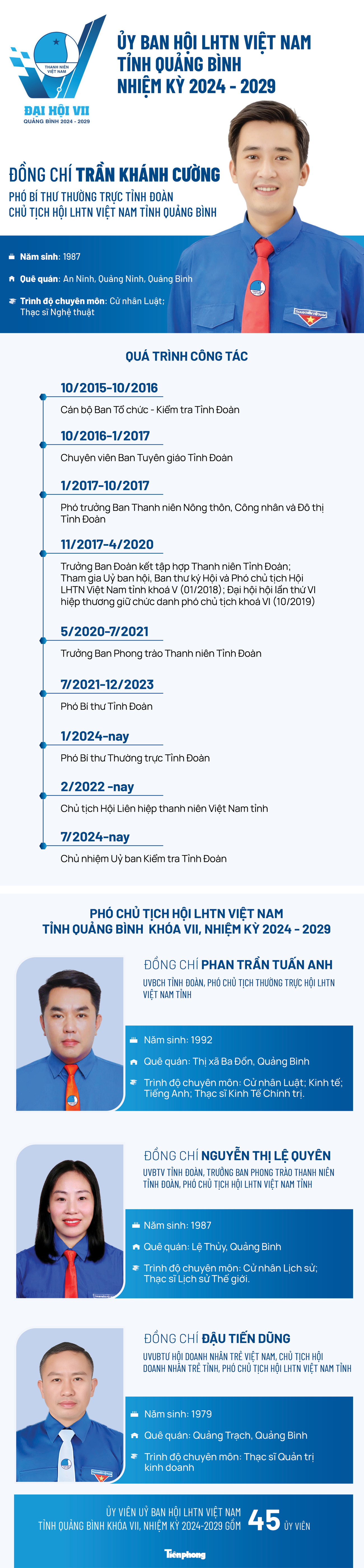 Hội LHTN Việt Nam tỉnh Quảng Bình lần thứ VII, nhiệm kỳ 2024 - 2029 đã hiệp thương chọn cử 45 anh chị tham gia Uỷ ban Hội LHTN Việt Nam tỉnh Quảng Bình nhiệm kỳ 2024 - 2029. Anh Trần Khánh Cường, Phó Bí thư Tỉnh Đoàn, Chủ tịch Hội LHTN Việt Nam tỉnh Quảng Bình khoá VI, tiếp tục được tín nhiệm làm Chủ tịch Hội LHTN Việt Nam tỉnh Quảng Bình khóa VII; các Phó Chủ tịch gồm các anh, chị: Phan Trần Tuấn Anh, Đậu Tiến Dũng và Nguyễn Thị Lệ Quyên.
