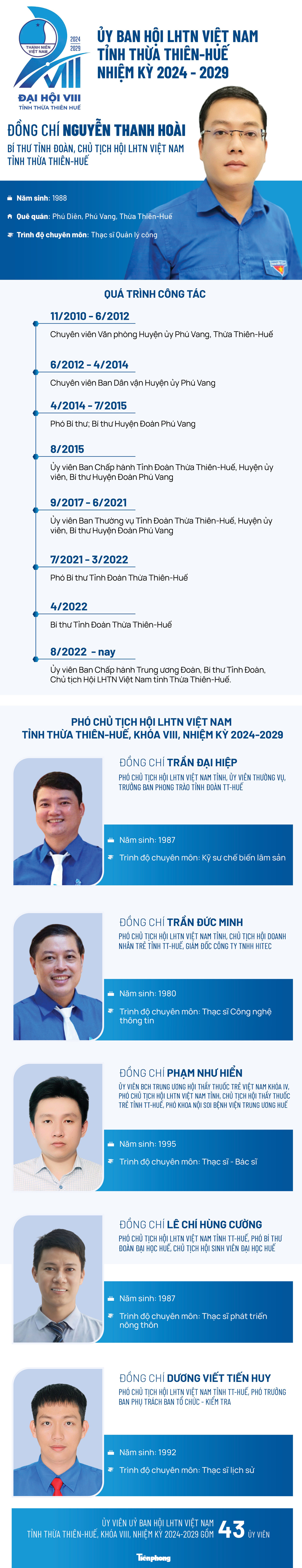 TPO - Đại hội đại biểu Hội LHTN Việt Nam tỉnh Thừa Thiên-Huế (TT-Huế) lần thứ VIII, nhiệm kỳ 2024-2029 đã hiệp thương chọn cử 43 ủy viên Ủy ban Hội LHTN Việt Nam tỉnh TT-Huế khóa VIII. Anh Nguyễn Thanh Hoài - Ủy viên T.Ư Đoàn, Bí thư Tỉnh Đoàn, tái đắc cử Chủ tịch Hội LHTN Việt Nam tỉnh TT-Huế.