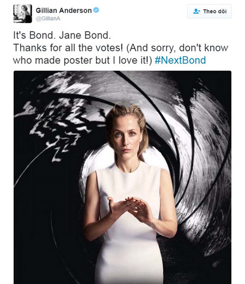 Mới đây, ngôi sao của bộ phim truyền hình The X-Files (Hồ sơ tuyệt mật) Gillian Anderson vừa tiết lộ trên trang cá nhân cô sẽ cân nhắc vào vai điệp viên 007 phiên bản nữ với tên gọi Jane Bond, The Guardian đưa tin.