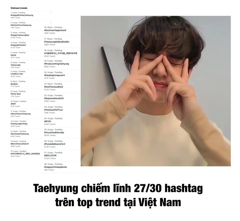 Tại Việt Nam, các hashtag liên quan đến sinh nhật V chiếm tới 27/30 hashtag trên top trending ở Twitter.