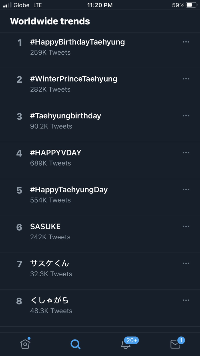 Từ trước ngày sinh nhật của V, hashtag liên quan đến anh cũng đã vào top trending trên các mạng xã hội. Và ngay những giây phút đầu tiên trong ngày sinh nhật của V, các hashtag liên quan đến nam idol đã gần như “chiếm sóng” toàn bộ các trang mạng xã hội.