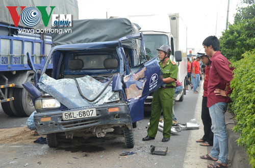 Lúc này, xe tải loại 1,3 tấn mang BKS 54L - 6807 đang cùng dừng chờ đèn tín hiệu phía sau thì bất ngờ bị xe đông lạnh BKS 54Z – 9187 do tài xế Nguyễn Mạnh Tùng ( 33 tuổi, quê Kom Tum) chạy tới đâm rất mạnh vào đuôi xe tải khiến xe này húc tiếp vào xe tải cẩu phía trước.