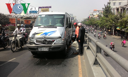 Tại hiện trường, xe ô tô 16 chỗ và 7 chỗ bị hư hỏng phần đầu và đuôi, vụ va chạm chiếm hết một làn đường trên cầu vượt bằng thép gây ùn xe kéo dài, may mắn không có thương tích gì về người.