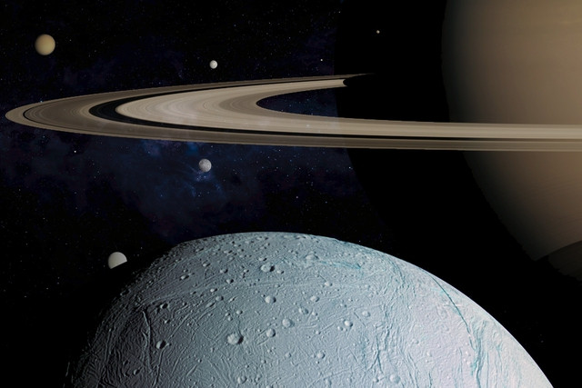 Sao Thổ dưới góc nhìn từ một trong các mặt trăng nổi tiếng nhất của nó - "mặt trăng sự sống" Enceladus - Ảnh đồ họa từ dữ liệu NASA