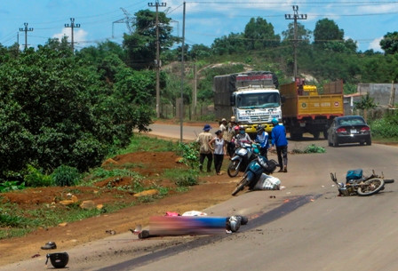Cú va chạm mạnh khiến chiếc xe bị văng ra xa, hai vợ chồng anh Tịnh ngồi trên xe gắn máy rơi xuống đường và bị cuốn vào gầm xe tải chết thảm.