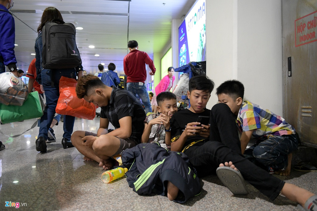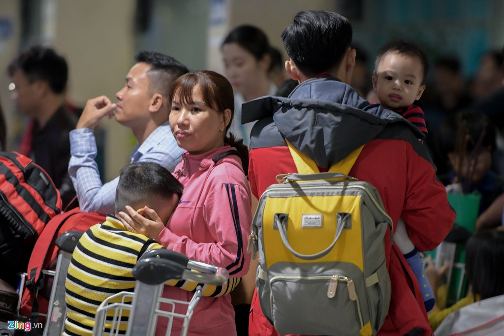 Nhiều trẻ em mệt mỏi gục đầu vào cha mẹ trong lúc chờ làm thủ tục. Cảng hàng không quốc tế Tân Sơn Nhất cho biết lượng khách trung bình nơi đây là 130.000 người mỗi ngày, tăng 10.500 khách so với dịp Tết năm trước.