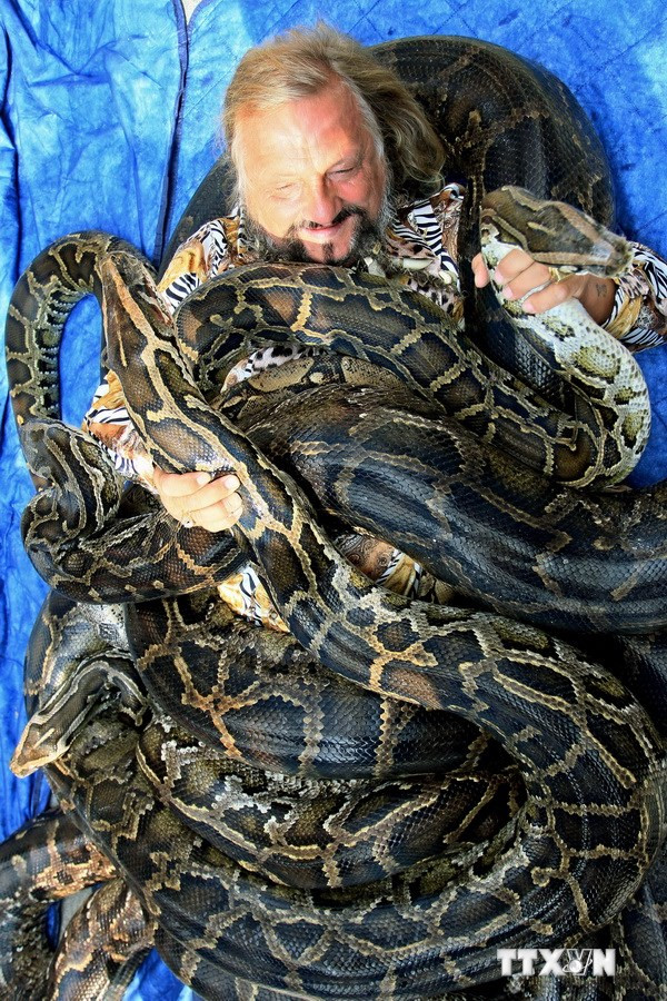 Ông Jaromir Joo, Giám đốc một rạp xiếc ở thành phố Brno, Cộng hòa Séc, đã để ba con trăn Mỹ nhiệt đới và hai con trăn khác, mỗi con dài khoảng 5m và tất cả nặng hơn 500kg nằm lên người.