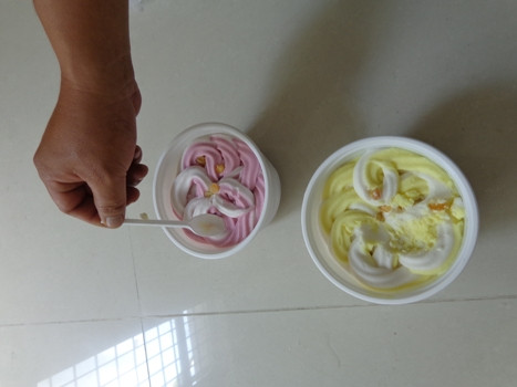 Cuối cùng, 1 “chiến hữu” của Quốc ở xã Trung An (TP.Mỹ Tho) đồng ý cho chúng tôi 2 hộp kem (loại ½ kg/hộp) với màu sắc, mùi vị bắt mắt vừa được sản xuất để… làm mẫu, còn có dám ăn hay không thì tùy chúng tôi.
