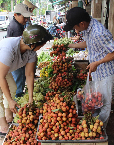Hình ảnh quen mắt những ngày này là vải được chất đầy trên các xe đẩy, lên lỏi đến khắp các tuyến đường từ trung tâm ra các quận xa ở TP HCM bày bán. Vải thiều ở đây được bán với giá 30.000 đồng một kg. Trung bình một ngày mỗi người bán rong tiêu thụ được 40-100 kg.