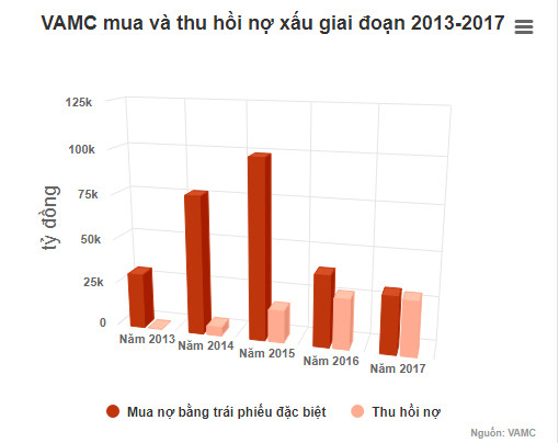 Cụ thể, tổng giá trị mua nợ bằng trái phiếu đặc biệt của doanh nghiệp này từ khi thành lập vào giữa năm 2013 đến cuối 2017 là 279.775 tỷ đồng. Giá trị mua nợ kỷ lục rơi vào năm 2015 khi con số này xấp xỉ 100.000 tỷ đồng. Cũng trong thời gian này, VAMC thu hồi được 81.280 tỷ đồng và bán 14.290 tỷ đồng nợ xấu.