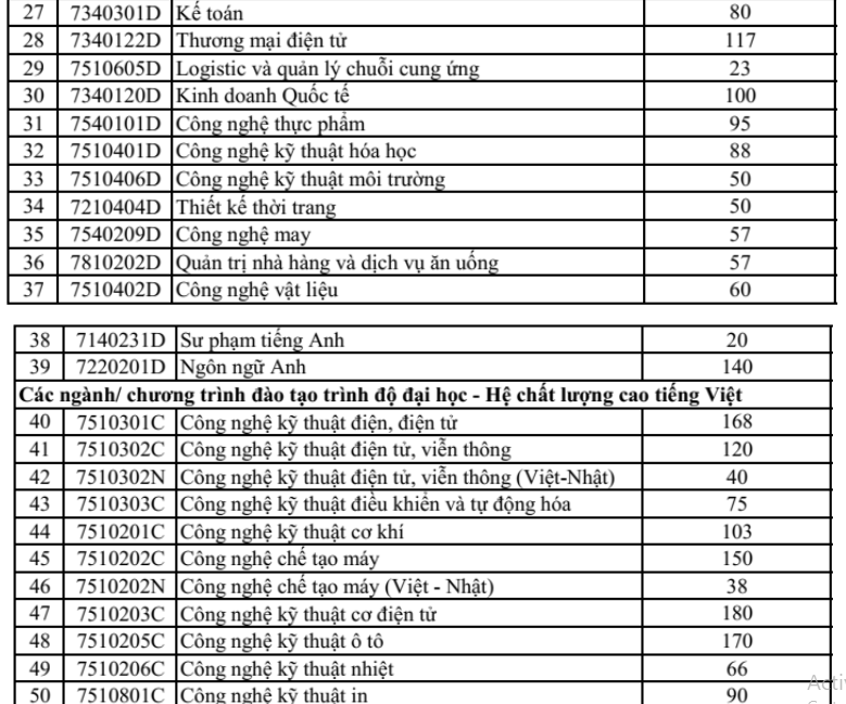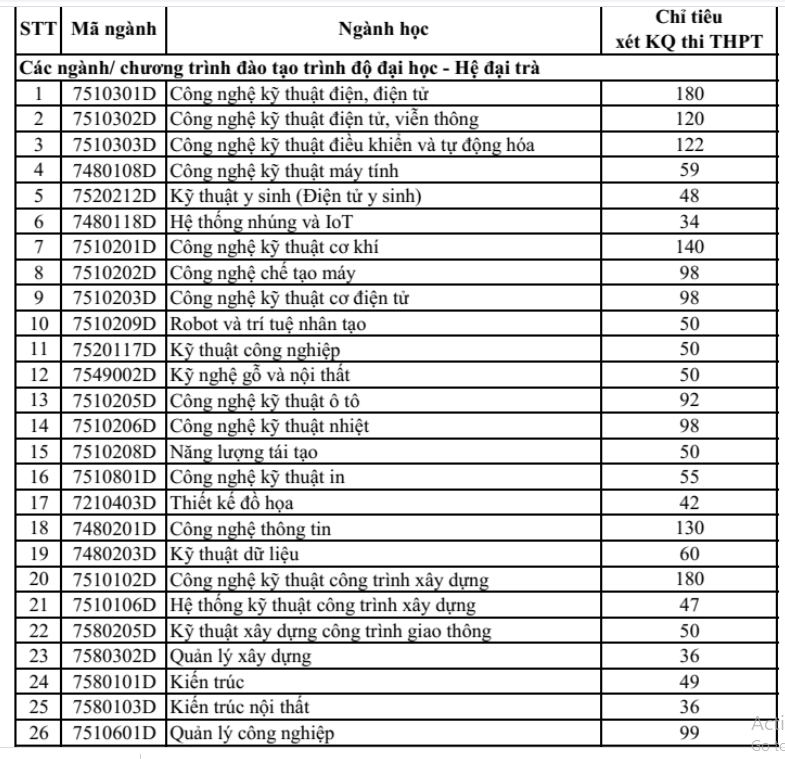 Một số ngành có chỉ tiêu xét tuyển cao như: Công nghệ Kỹ thuật Điện, Điện tử; Công nghệ Kỹ thuật Công trình xây dựng Công nghệ Kỹ thuật Cơ Điện tử (cùng 180 chỉ tiêu); Công nghệ Kỹ thuật Ô tô (170 chỉ tiêu), Công nghệ thông tin – Hệ chất lượng cao (169 chỉ tiêu); Công nghệ Kỹ thuật Cơ khí, Ngôn ngữ Anh (140 chỉ tiêu); Công nghệ thông tin – Hệ đại trà (130 chỉ tiêu); Công nghệ Kỹ thuật Điện tử Viễn thông (120 chỉ tiêu); Công nghệ Kỹ thuật Điều khiển và Tự động hóa (122 chỉ tiêu); Thương mại điện tử (117 chỉ tiêu)... Các ngành còn lại từ 50 - 98 chỉ tiêu. Ít nhất là ngành Sư phạm Tiếng Anh với 20 chỉ tiêu.