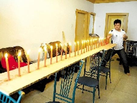 Trước chiếc bàn bầy sẵn 15 cây nến có khoảng cách trung bình 10cm và ngọn xa nhất cách khoảng 3 m, hai phóng viên nam và nữ đã thử bắt chước thực hiện phần trình diễn nhưng đều thất bại.