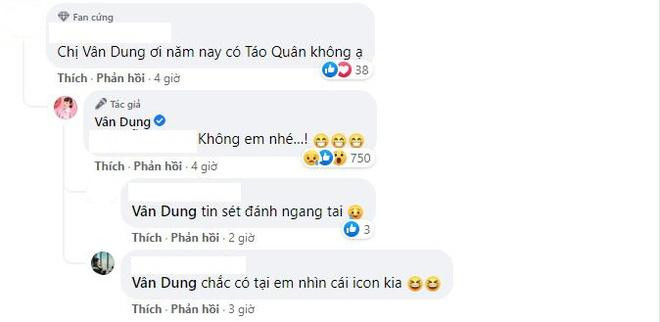 Sau một năm vắng bóng, sự trở lại của Táo Quân 2021 thu hút sự quan tâm đặc biệt từ khán giả. Cho đến năm nay, không ít câu hỏi được đặt ra về việc có hay không chương trình Táo quân 2022. Cụ thể, khi được một fan cứng đặt câu hỏi trên Fanpage: "Chị Vân Dung ơi, năm nay có Táo Quân không ạ?", nữ diễn viên trả lời rất ngắn gọn: "Không em nhé!".