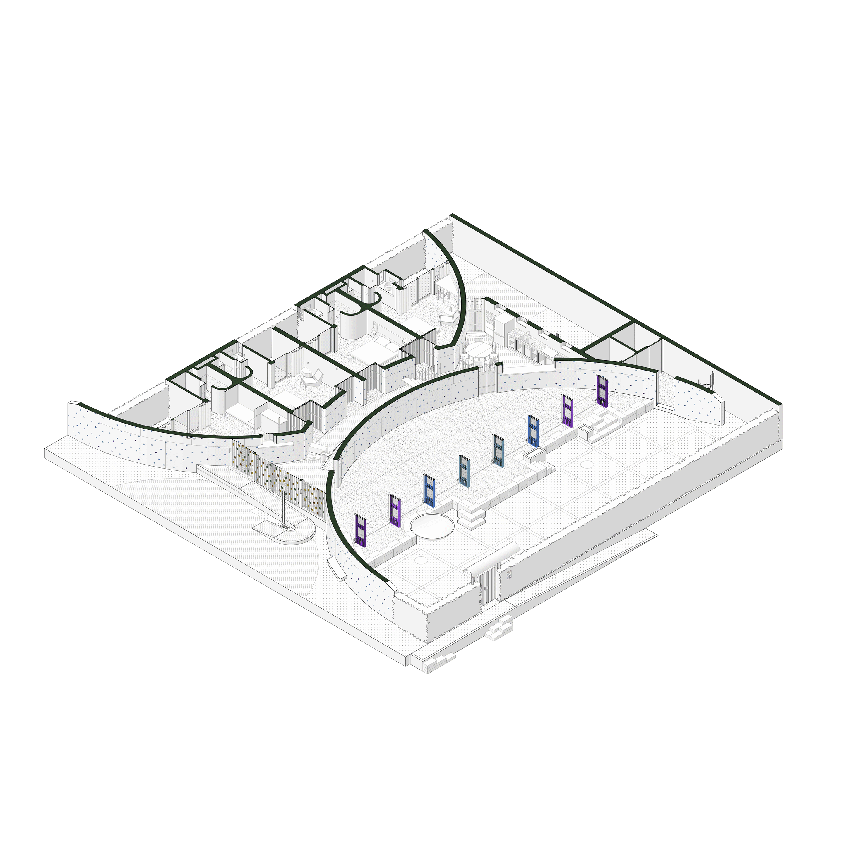 Nửa cung tròn thứ 2 ngăn các phòng lưu trú hướng ra khoảng sân sau riêng tư hơn bằng khoảng đệm hành lang mở rộng ở hai đầu, cũng là 2 cạnh của ranh khu đất. Dehue đón tiếp khách lưu trú bằng 1 ram dốc chậm rãi, 1 khoảng đợi ngoài sân với cây mai và cây cóc được mua lại từ những nhà dân trong khu vực giải tỏa. Hành lang đóng dần khi vào các phòng lưu trú và mở rộng ra hết cỡ ở khu bếp ăn.