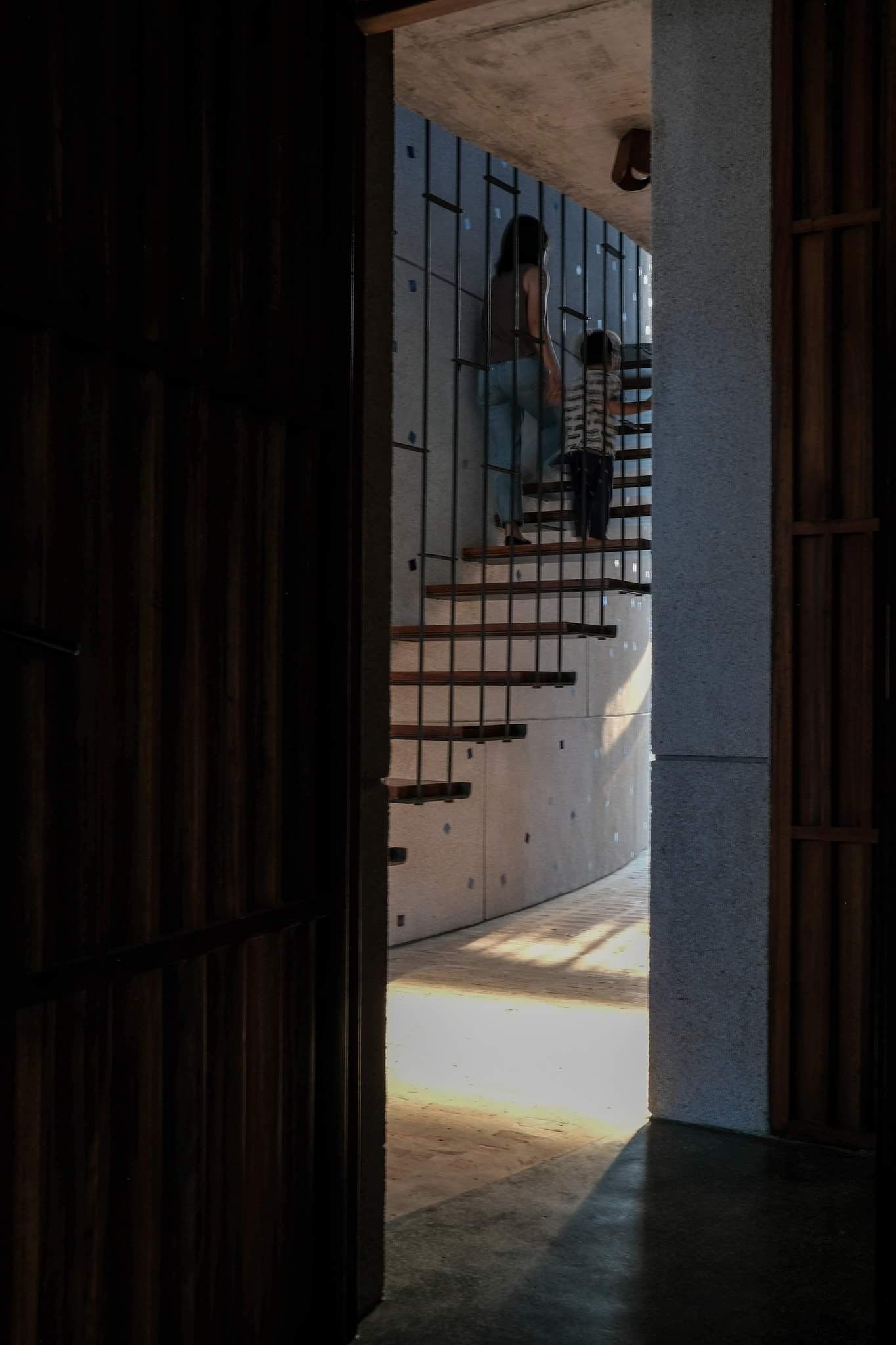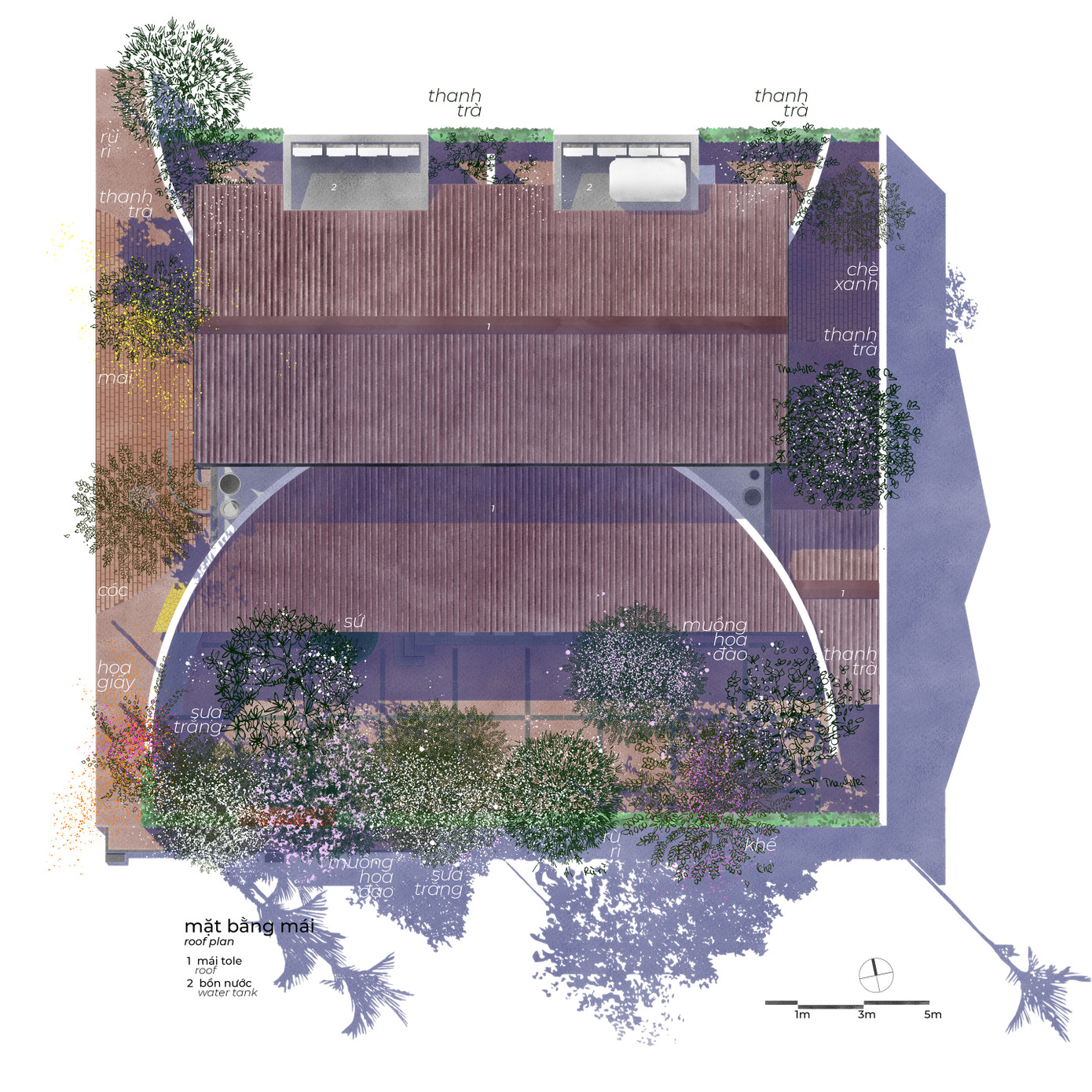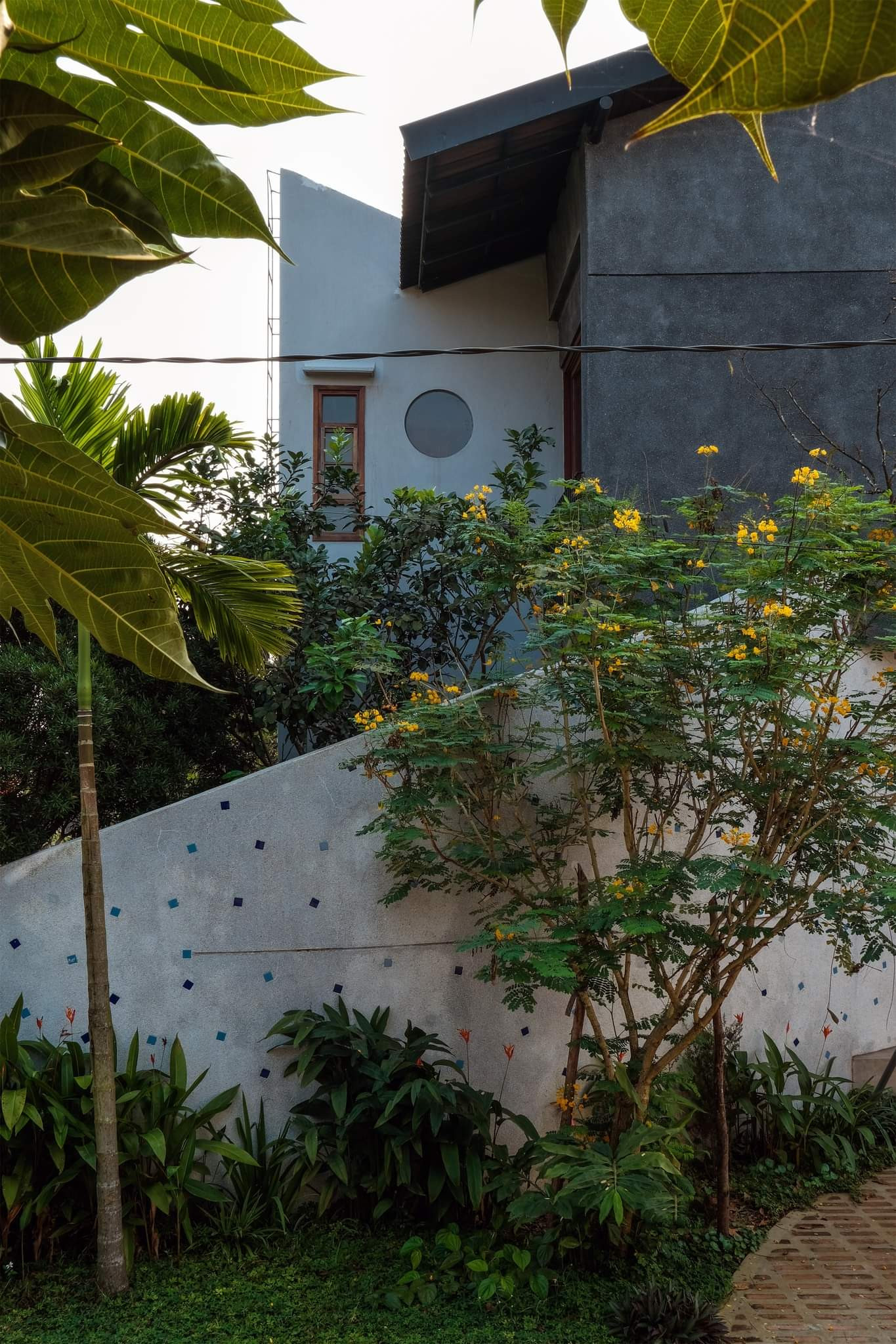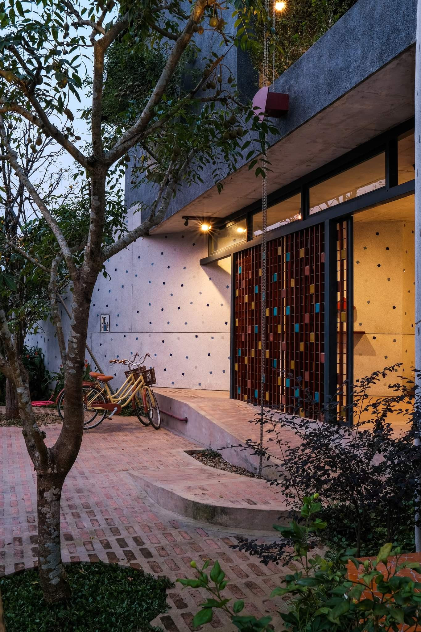 Mọi hoạt động đều được định hướng ra ngoài các khoảng không gian sân vườn này và đi xuyên qua chúng. Các không gian bao gồm không gian sinh hoạt chung, 7 phòng lưu trú, bếp chung và không gian phụ trợ. Tất cả đều nằm giữa khoảng vườn xanh.