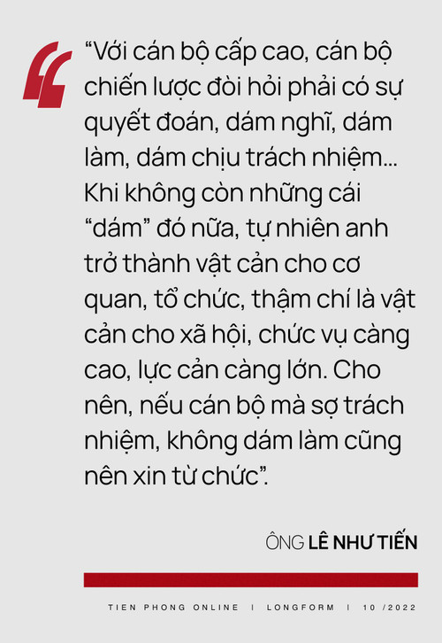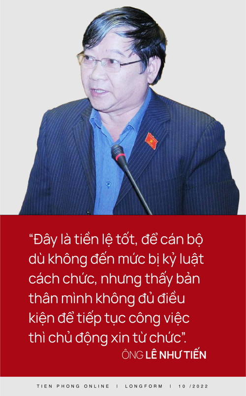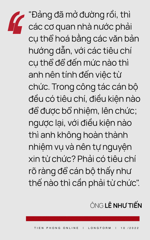 Quả đúng là như vậy. Tôi đã từng phát biểu, không phải chỉ những người có tỳ vết, bị kỷ luật đâu, mà có những trường hợp không đủ uy tín, năng lực, dù chưa đến mức bị kỷ luật nhưng nếu cảm thấy vị trí này, công việc này quá nặng với mình, thấy gánh không nổi, hay vì lý do sức khoẻ, gánh nặng từ phía gia đình…họ cũng nên xin từ chức. Điều đó cũng tạo điều kiện tốt cho người khác phát triển.