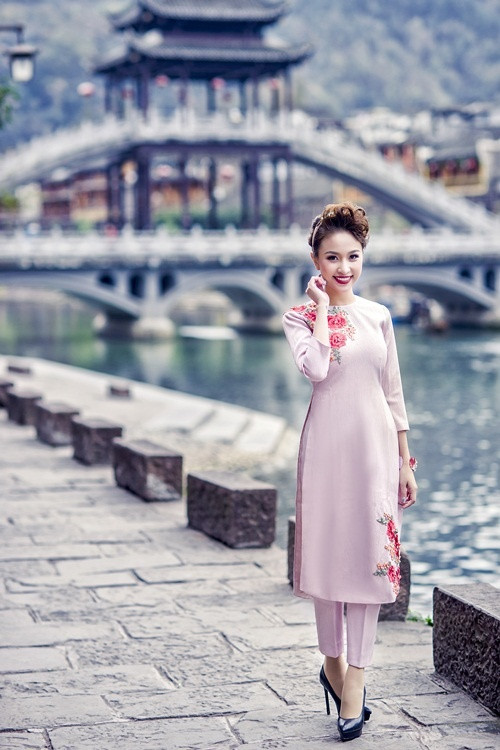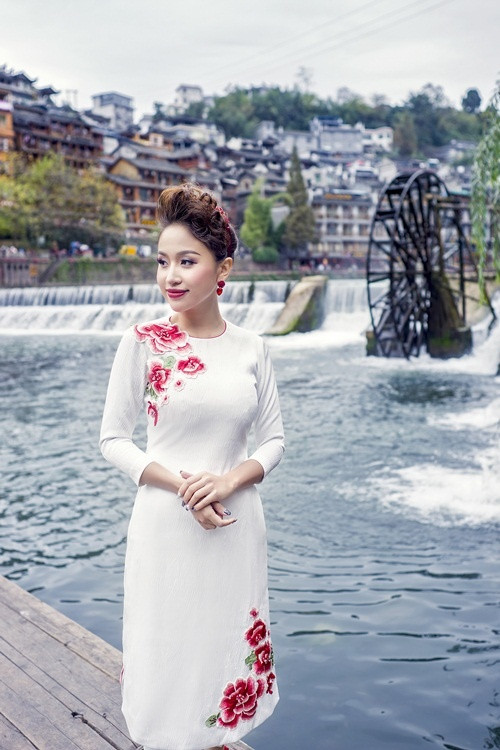 Nữ diễn viên diện áo dài hoa tay lửng với quần cộc khi thăm thắng cảnh nổi tiếng của Trung Quốc.