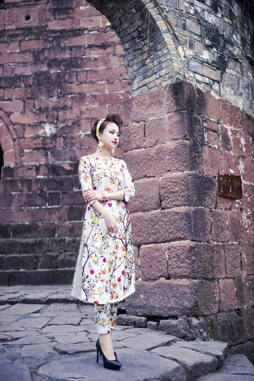 Áo dài in hoa cách tân mặc cùng quần âu là xu hướng được nhiều người Việt ưa chuộng trong khoảng ba năm nay.