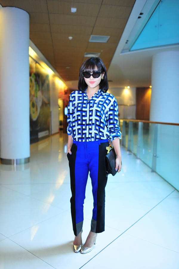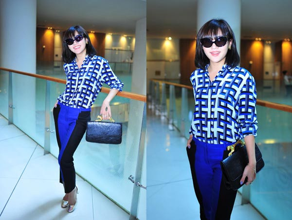 Nữ ca sĩ mặc áo kẻ ca-rô xanh trắng, kết hợp cùng quần tiệp màu, đeo kính đen cực ngầu.