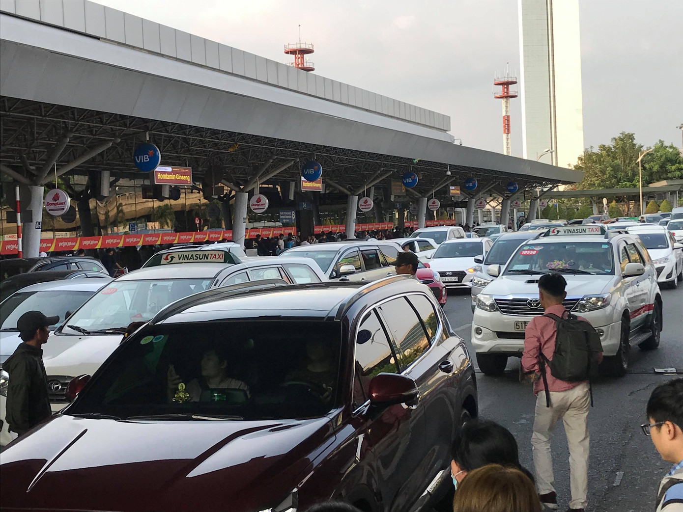 Không chỉ bên trong nhà ga, bên ngoài đường dẫn vào cũng đông nghẹt ô tô đưa tiễn người đi máy bay.