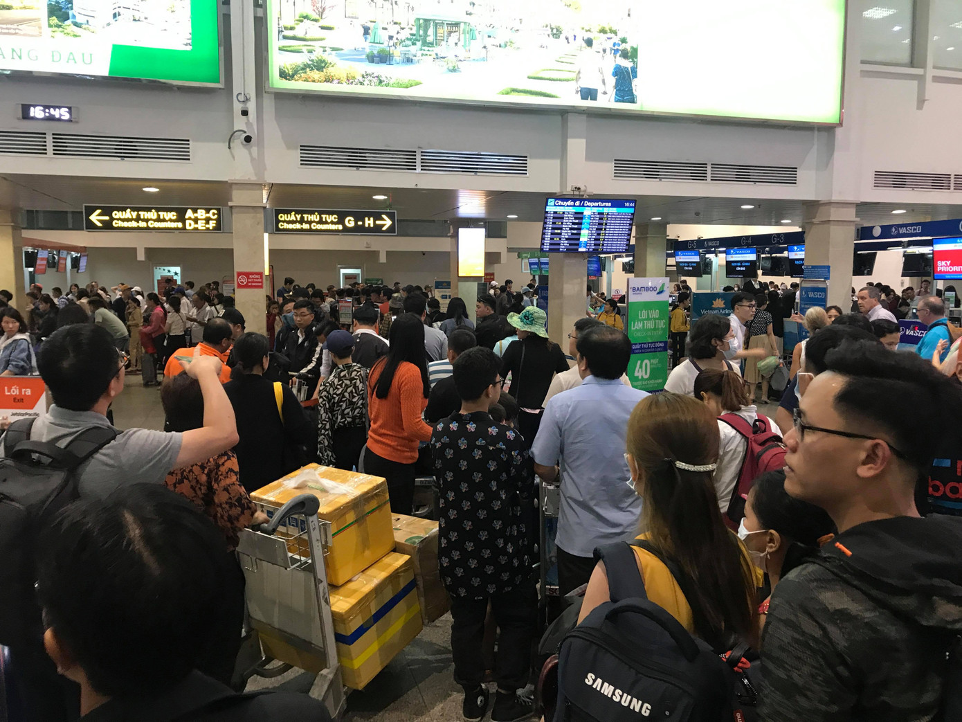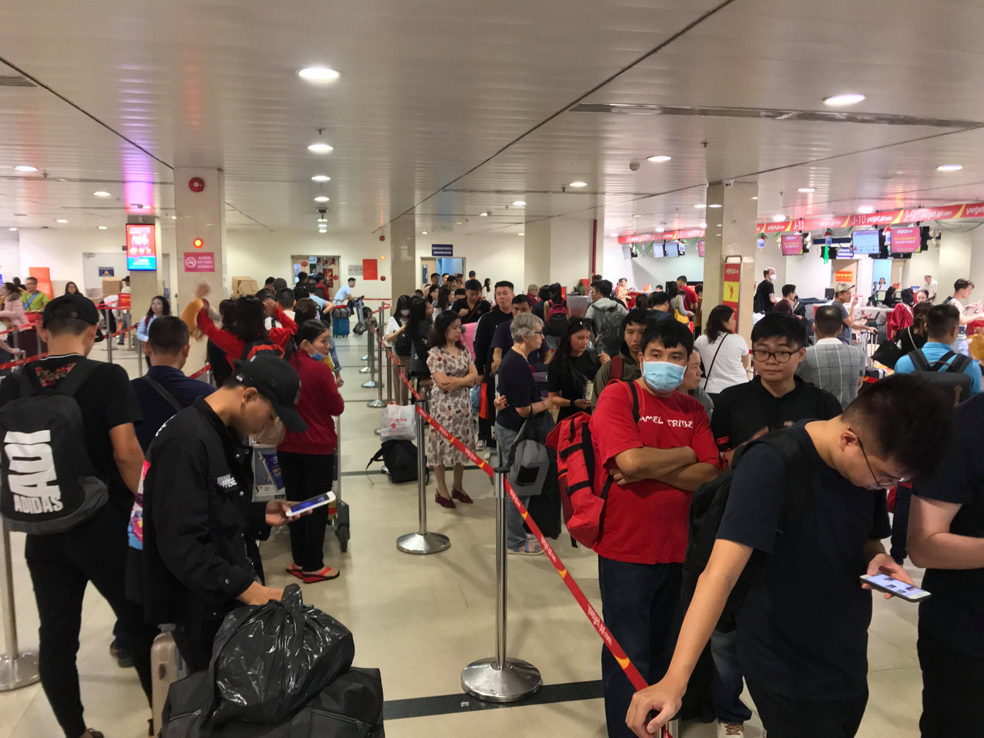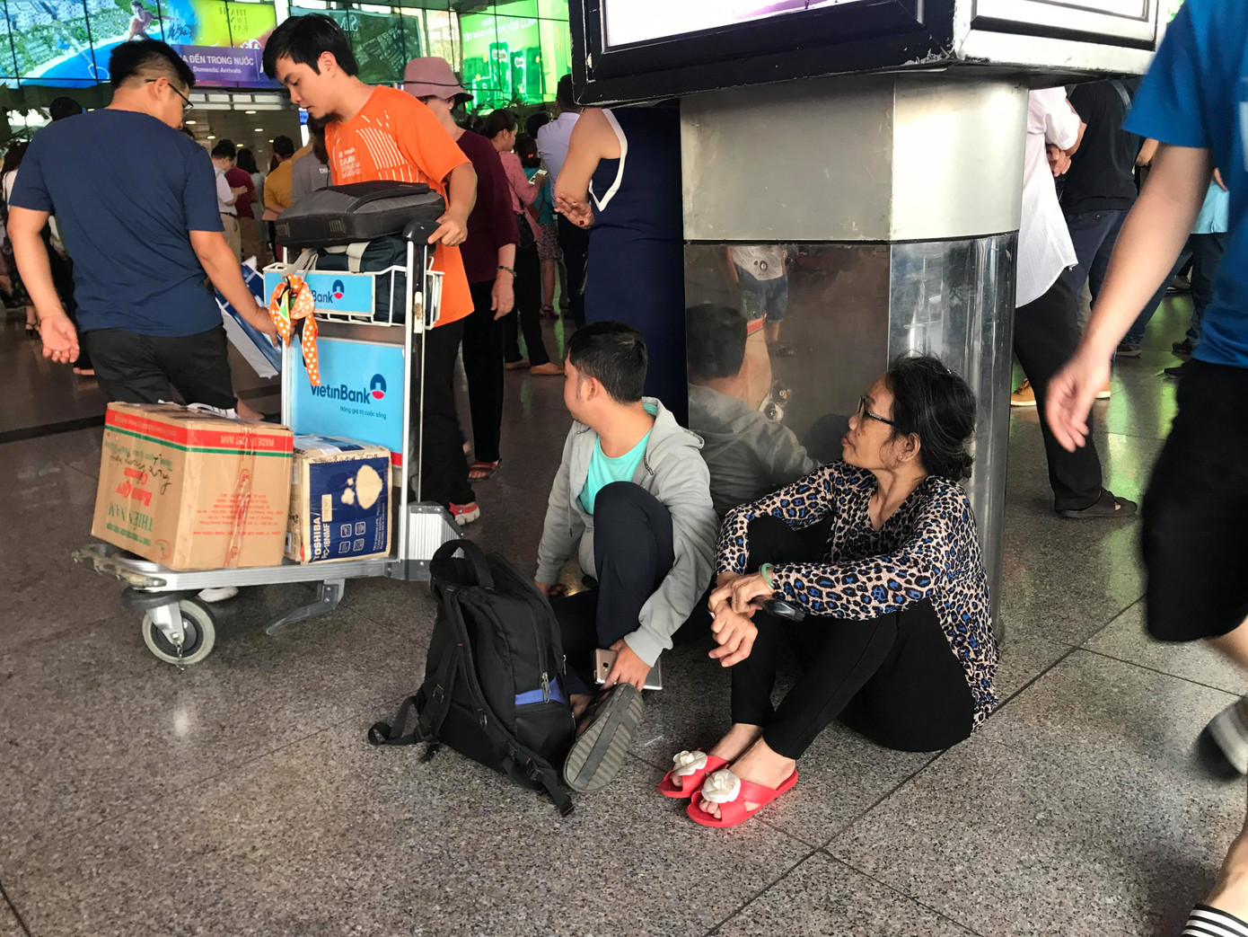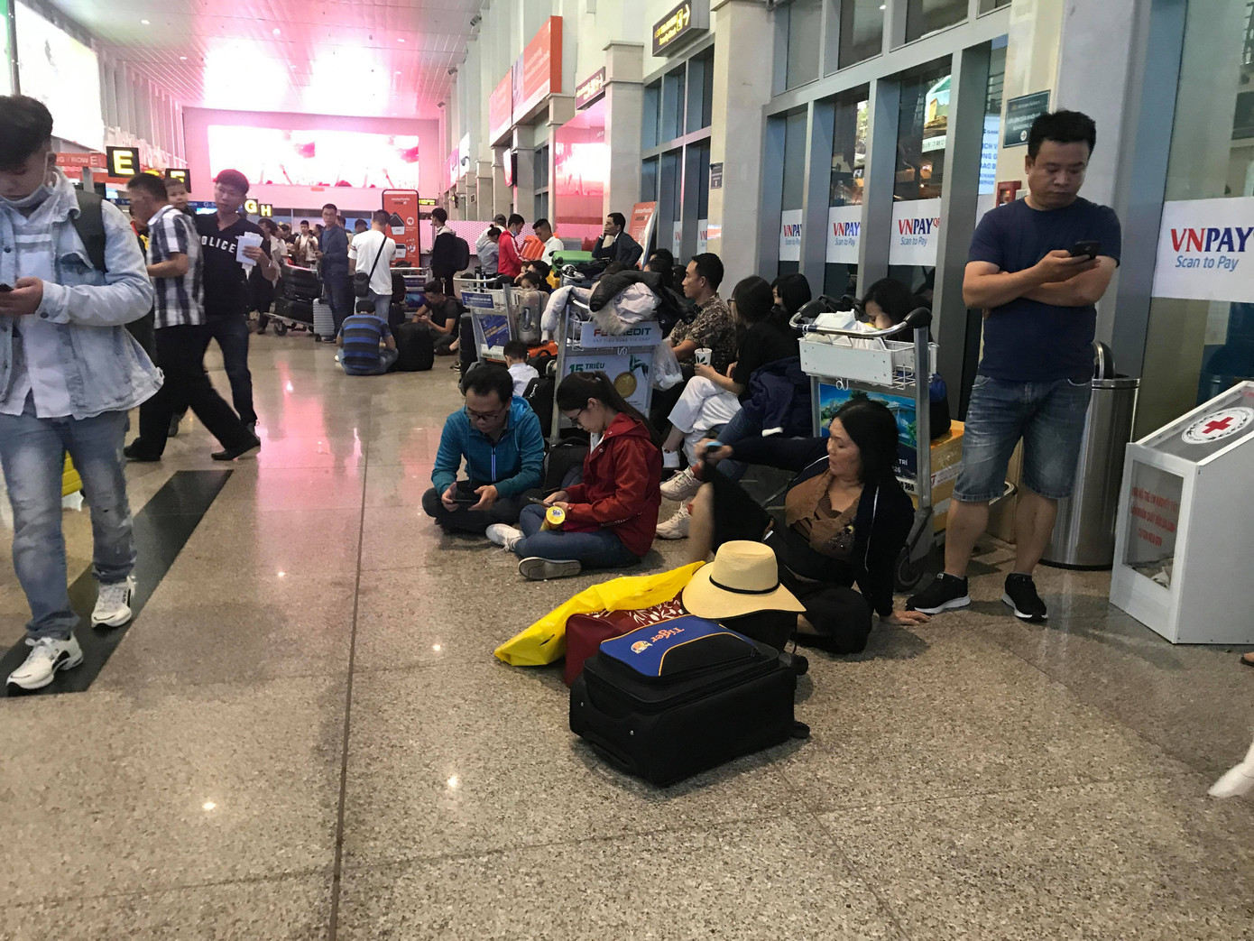 Số lượng chuyến bay lớn kéo theo một số chuyến bị trễ giờ khiến hàng vạn người ngồi, nằm vật vờ ở sân bay để đợi.